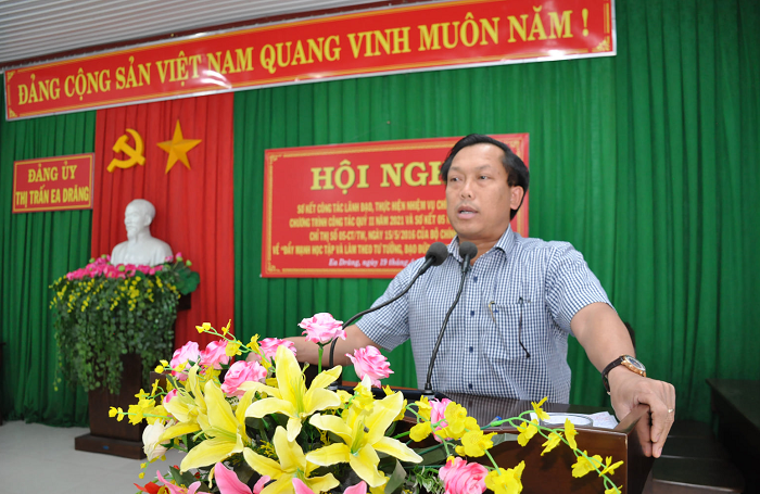 Ngày 19 tháng 4 năm 2021, Đảng uỷ thị trấn Ea Drăng tổ chức Lễ trao tặng Huy hiệu Đảng và sơ kết công tác lãnh đạo, thực hiện nhiệm vụ chính trị quý I, triển khai chương tình công tác quý II/2021 và sơ kết 05 năm triển khai thực hiện Chỉ thị số 05-CT/TW, ngày 15/5/2016 của Bộ Chính trị khoá XII về “Đẩy mạnh học tập và làm theo tư tưởng, đạo đức, phong cách Hồ Chí Minh”.
