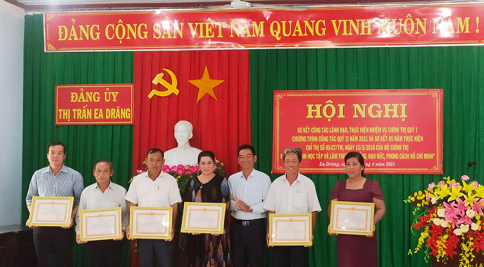 Nhân dịp này, Đảng uỷ thị trấn Ea Drăng đã tặng giấy khen cho 04 tập thể và 06 cá nhân có thành tích xuất sắc trong triển khai thực hiện Chỉ thị số 05-CT/TW, ngày 15/5/2016 của Bộ Chính trị khoá XII về “Đẩy mạnh học tập và làm theo tư tưởng, đạo đức, phong cách Hồ Chí Minh”./.