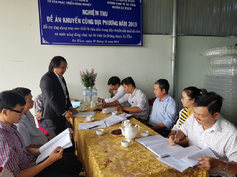 Ngày 30/10/2019, Trung tâm Khuyến công đầu tư và Phát triển công nghiệp tỉnh Đắk Lắk đã phối hợp với Phòng Kinh tế và Hạ tầng tổ chức nghiệm thu Đề án hỗ trợ ứng dụng máy móc thiết bị trong dây chuyền sản xuất đá viên và nước uống đóng chai tại thị trấn Ea Drăng, huyện Ea H’Leo.