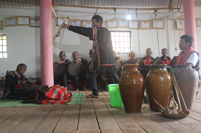 Ảnh: Cùng với việc diễn tấu Bài chiêng cổ, Thầy cúng Y BLih cúng mừng lúa mới cho gia đình ông MLô Y Quan