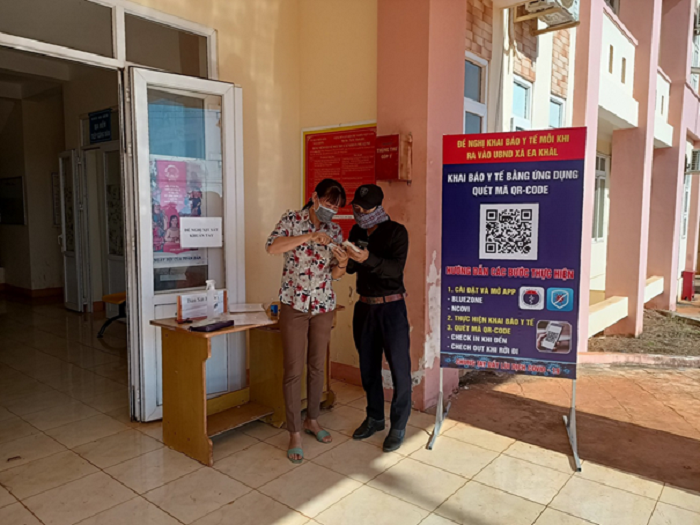 Ảnh: Ứng dụng công nghệ thông tin quét mã QR phòng, chống dịch bệnh Covid-19 tại UBND xã Ea Khăl huyện Ea H’leo.