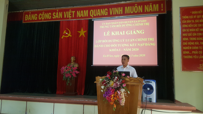 Ngày 17/3/2020, Trung tâm bồi dưỡng chính trị huyện Ea H'Leo khai giảng Lớp bồi dưỡng lý luận chính trị cho đối tượng kết nạp đảng, khóa I - năm 2020. Về dự Lễ khai giảng, có ông Nguyễn Ngọc Hoàng – Phó Bí thư Huyện ủy, đại diện các Ban xây dựng đảng của Huyện ủy và 80 học viên, là những quần chúng ưu tú do các cơ sở Đảng trực thuộc Huyện ủy cử đi học.