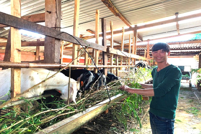 Năm 2012, sau khi cưới vợ ra ở riêng đựơc bố mẹ cho 04 sào đất, vợ chồng anh Lê Thảo trồng được gần 600 trụ Tiêu, khi tiêu bắt đầu cho thu hoạch thì bị dịch bệnh chết hàng loạt. Anh Thảo suy nghĩ nếu tiếp tục trồng lại Tiêu thì độ rủi ro cao nên anh đã quyết định chuyển đổi hướng làm ăn mới. Sau khi đi tham quan một số mô hình nuôi Dê trên địa bàn xã anh nhận thấy chăn nuôi Dê mang lại hiệu quả kinh tế cao, chi phí đầu tư thấp, ít tốn công chăm sóc và diện tích chuồng nuôi không lớn. Vào năm 2017, vợ chồng anh đã dùng số tiền tích lũy cùng với vay mượn thêm đầu tư làm chuồng trại và mua 05 con Dê mẹ về nuôi. Nhờ chăn nuôi theo đúng quy trình kỹ thuật, chăm sóc chu đáo nên đàn Dê ngày càng phát triển và mang lại nguồn thu nhập khá cho gia đình anh. Với thành công bước đầu, vợ chồng anh tiếp tục đầu tư mở rộng chuồng trại chăn nuôi và tăng quy mô đàn Dê. Đến nay, gia đình anh có 300 con Dê lớn, nhỏ, trong đó có hơn 50 con Dê mẹ. Bình quân mỗi năm Dê đẻ 02 lứa, mỗi lứa 02 con, đặc biệt có những lứa lên đến 03 - 04 con. Dê nuôi khoảng 06 tháng có thể đạt trọng lượng từ 25 đến 30 kg, số lượng Dê đều được các Nhà hàng trong và ngoài địa bàn tiêu thụ với giá bán giao động từ 120.000 đến 135.000 đồng/kg. Không chỉ bán Dê thịt, gia đình anh Thảo còn bán con giống, sau khi trừ hết chi phí, gia đình anh có thu nhập hơn 300 triệu đồng mỗi năm.