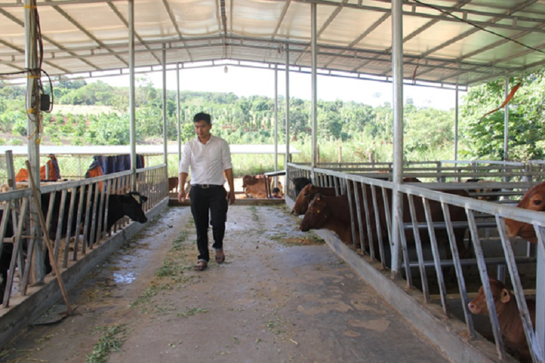Sinh năm 1988, đã sở hữu cơ ngơi hàng chục ha với vốn đầu tư hơn 20 tỷ đồng, nhưng hầu hết đều là tiền đi vay, vậy mới thấy chàng trai này quả là người táo bạo đến mức liều lĩnh. Chưa kể anh cũng là dân tay ngang làm nông nghiệp vì đang là cán bộ một Chi nhánh ngân hàng trên địa bàn huyện. Để phát triển trang trại tổng hợp theo hướng bền vững, anh tìm cộng sự là những người tin tưởng, có tâm huyết và kiến thức về nông nghiệp, nhất là am hiểu về nông nghiệp hữu cơ về phụ trách kỹ thuật, thú y và quản lý trang trại. Nhưng bỏ số tiền lớn đầu tư, trong khi phần lớn các loại cây trồng chưa cho thu nhập đáng kể, tiền đâu duy trì sản xuất và trả nợ ngân hàng? Cơ sở cho sự liều lĩnh của anh Quang chính là khu trại bò cách đó không xa. Trại có quy mô 200 con bò Úc nuôi thịt và sinh sản, được xây dựng cách liên hoàn khép kín, sạch sẽ và không gây ô nhiễm môi trường. Mỗi năm trang trại này xuất bán gần 100 con bò thịt và 40 con bê giống tại thị trường trong và ngoài tỉnh, thu nhập hàng trăm triệu đồng, là nguồn thu nhập chủ yếu của hệ thống trang trại tổng hợp của anh Quang.