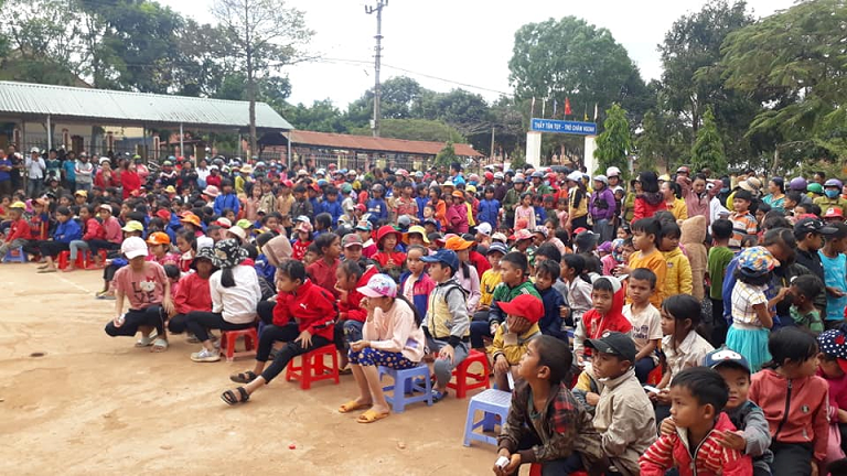 Ảnh: Đoàn từ thiện tặng quà cho các em học sinh nghèo.