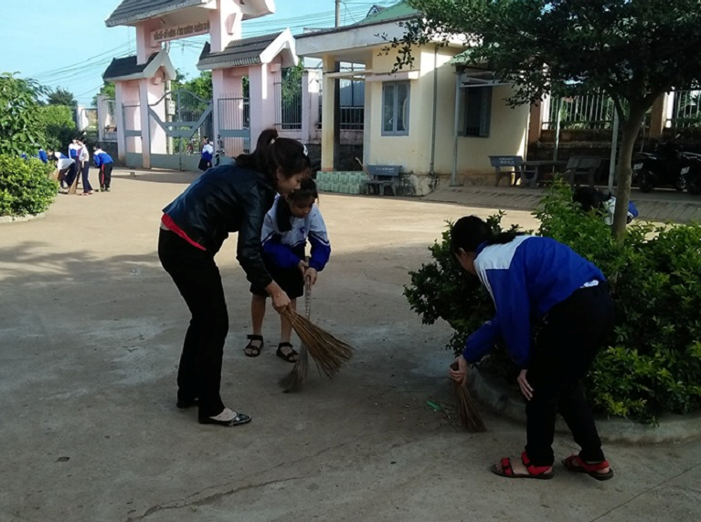 Ảnh: Cô tổng phụ trách đội cùng các em tham gia vệ sinh sân trường.