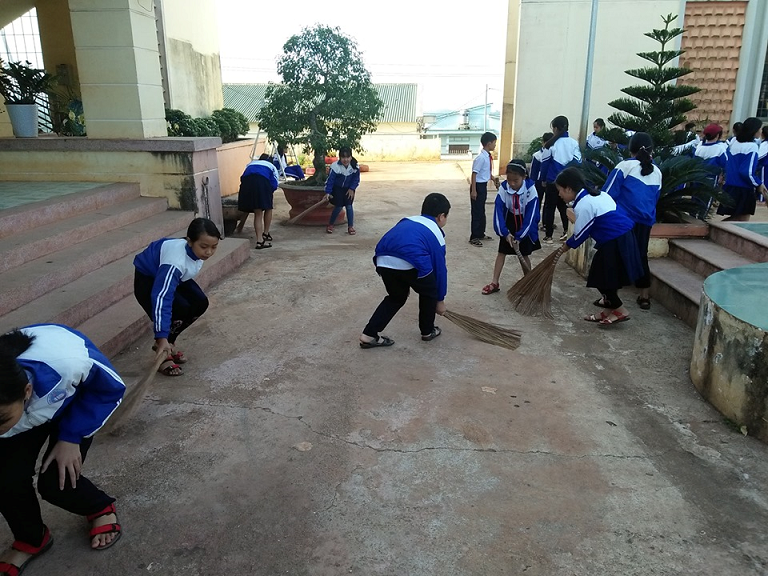 Ảnh: Các em học sinh dọn vệ sinh tại sân trường.